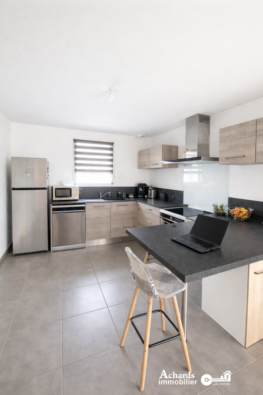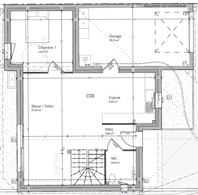 Au rez-de-chaussée, elle offre une entrée, un salon-séjour lumineux avec cuisine aménagée, une chambre, une salle d’eau, un WC indépendant et un garage de 23 m².